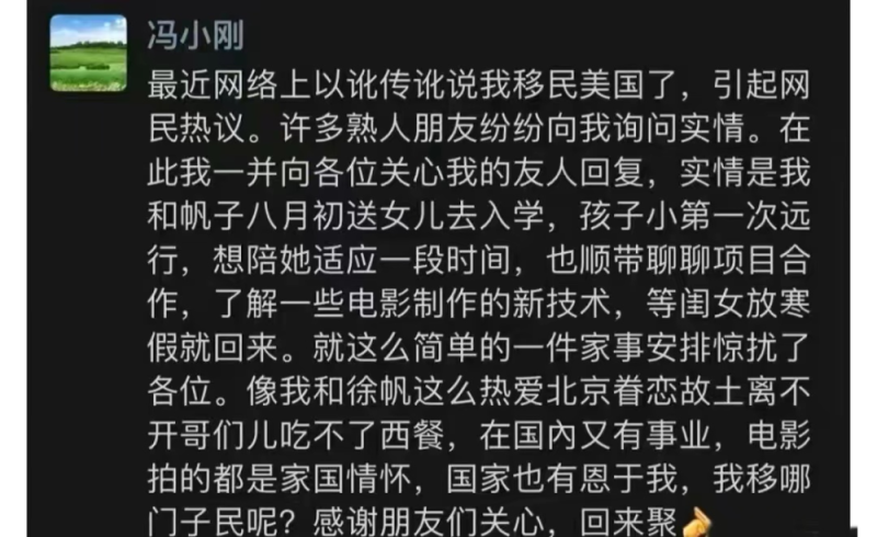 但之后冯小刚已经出面否认移民,解释自己和妻子徐帆只是送女儿出国读书,因为女儿第一次出远门,陪着她去适应一段时间,并表示和徐帆热爱北京眷恋故土,吃不了西餐,国家有恩于他,他不会移民。