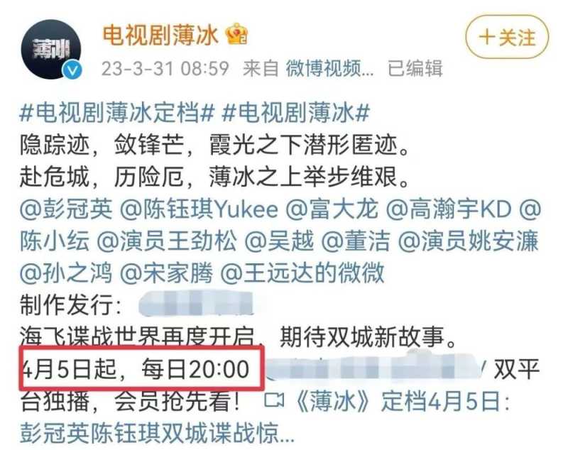 3月末刚刚推出了靳东主演的《无间》,没想到4月初就迎来了新对手,由彭冠英、陈钰琪主演的悬疑谍战剧《薄冰》定档在了4月5日。