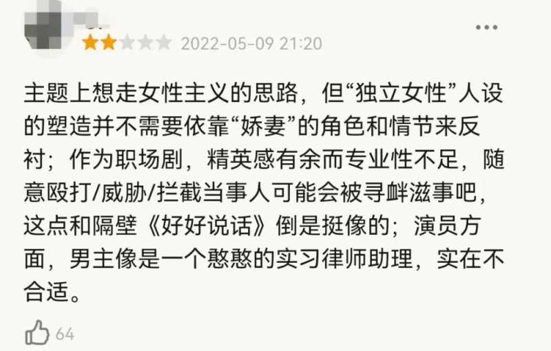 实际上,很多女性题材的剧都在挂羊头卖狗肉,拍得肤浅又无聊,希望这部剧能够重视女性的价值与魅力,才会获得好的口碑。