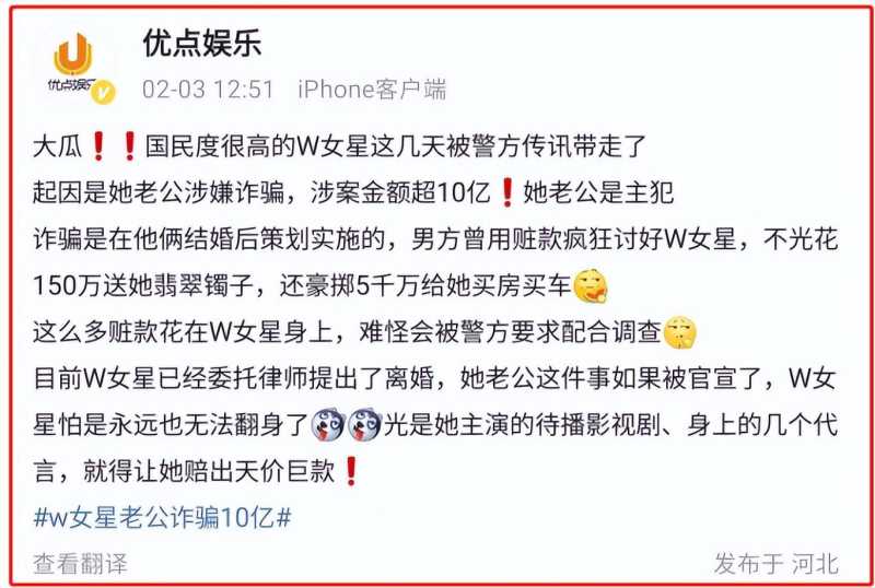 这几天,知名大V爆料说,圈内某W姓女星的老公詹某涉嫌诈骗,女星也受到了牵连。