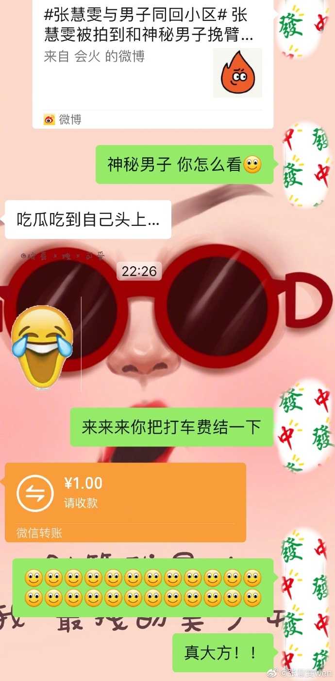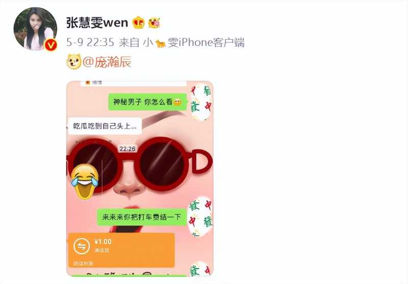 结果张慧雯转身来了个辟谣,表示吃瓜吃到自己头上了,还晒出了聊天截图。图中张慧雯将新闻发给了庞瀚辰,问他怎么看。