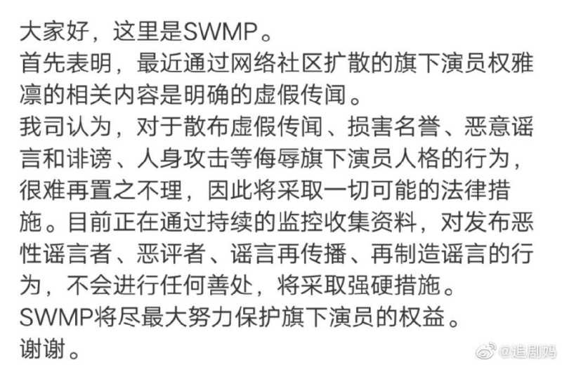 男方粉丝指责她倒贴男方,炒作恋情等等,随后权雅凛公司发文,否认了她与NCT成员道英的恋爱传闻,同时针对恶意攻击等行为,将采取法律措施。