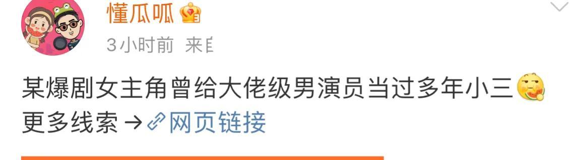视频,一开始懂瓜呱就表明该女星的身份,是一位知名女星,拍过爆款剧,但是她给大佬级的男演员当过小三。