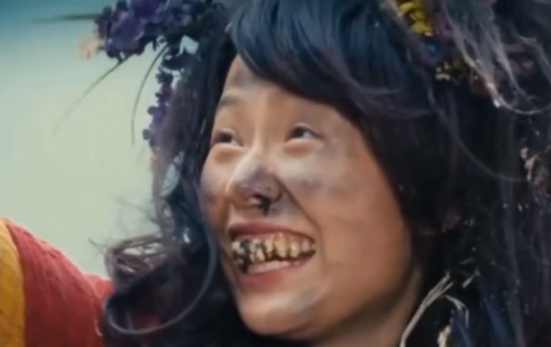 但最经典的扮丑,我觉得还得是阿Sa在《情癫大圣》里的这个丑妆,蓬头垢面、龅牙还爆豆,连鼻子都那么不规则,可以算得上是扮丑教科书了。