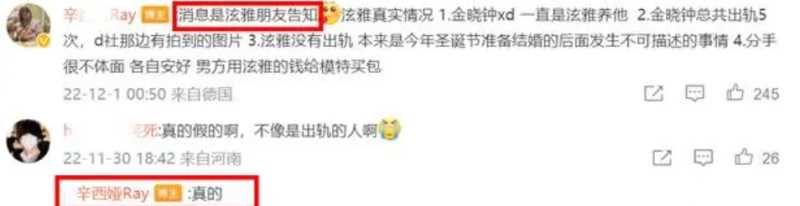 不仅如此,就在金晓钟给金泫雅澄清后不久,就有更详细的男方出轨消息传出,爆料提及金晓钟不但靠女方吃饭,还总共出轨5次,二人本来准备圣诞节结婚了,结果后面发生了不可描述的事(捉奸在床?),男方还用女方的钱给小三买包。