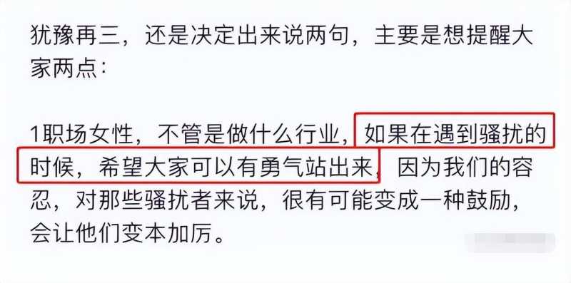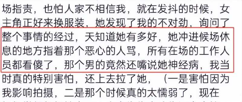 她在社交平台上称,曾经有次拍戏男演员路过时趁机上手捏她屁股,当时她因为不敢揭露此人,只能在被骚扰之后偷偷哭泣。