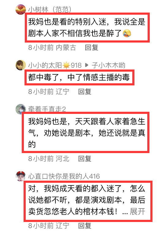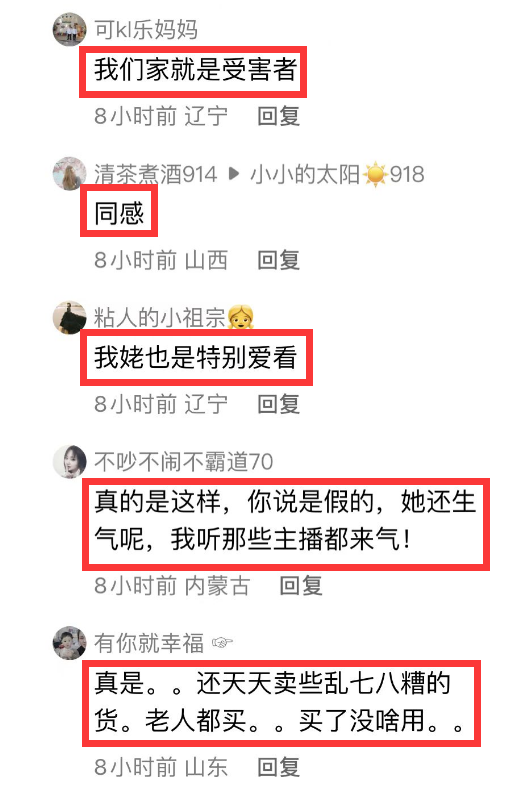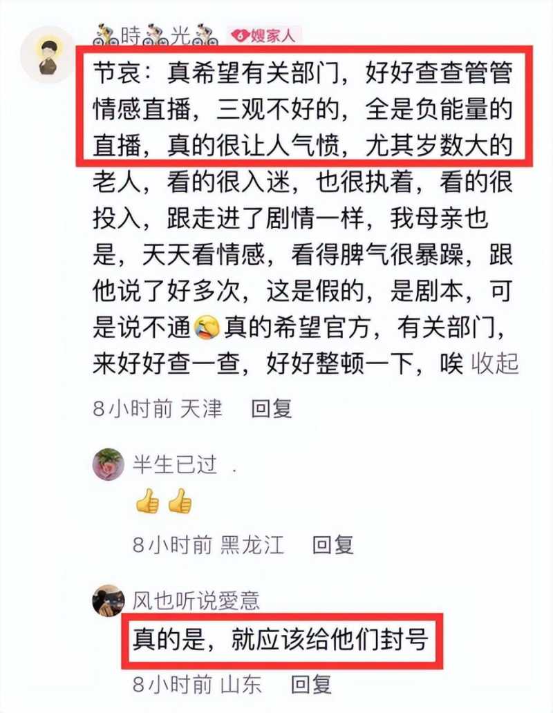 评论区也有很多网友留言,说自己家中的老人也是这样,还建议相关部门好好管一管,三观不好的,负能量的情感直播最好整顿一下,这样也确实能够避免很多老年人上当,净化下直播环境。