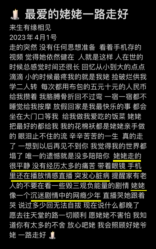 张二嫂告知姥姥走得很平静,没有经历太多痛苦,而离世前姥姥正戴着眼镜用手机观看情感直播,没想到突发心脏病,还没来及抢救就匆匆离开了人间。