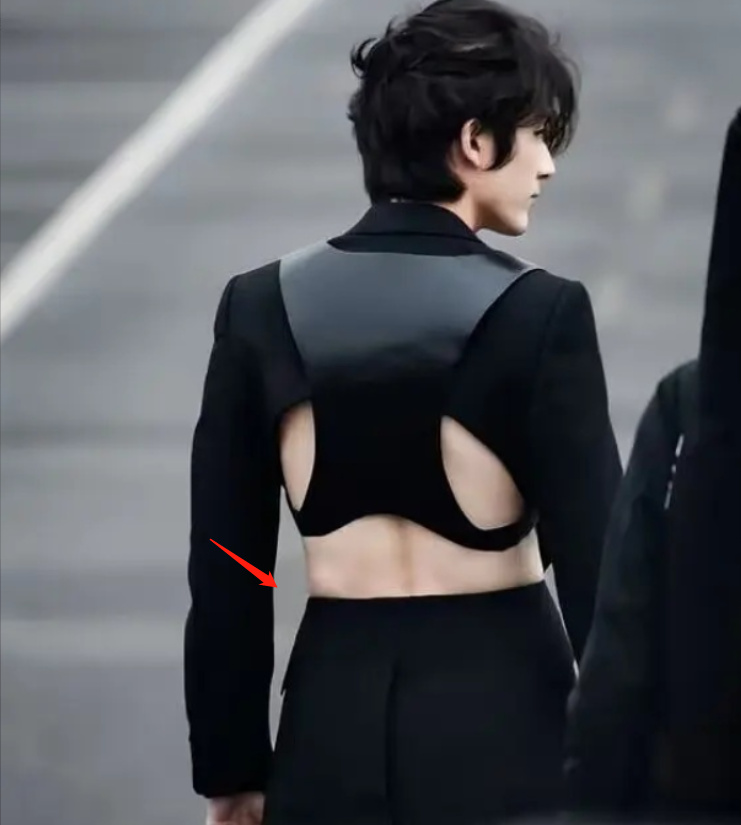 舍弃打底,真空上阵,大方袒露出胸口的肌肉,转过身去,背部同样“精彩”:同样镂空了不说,衣服的装饰,也像那些年在学生间流行的“背背佳”。