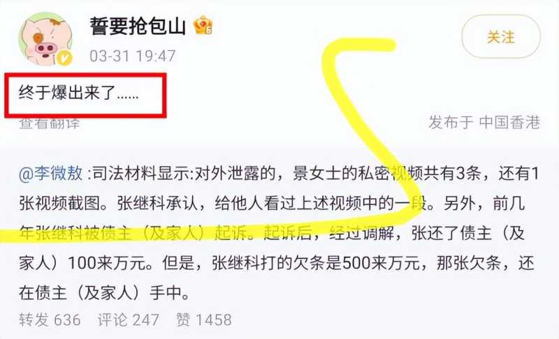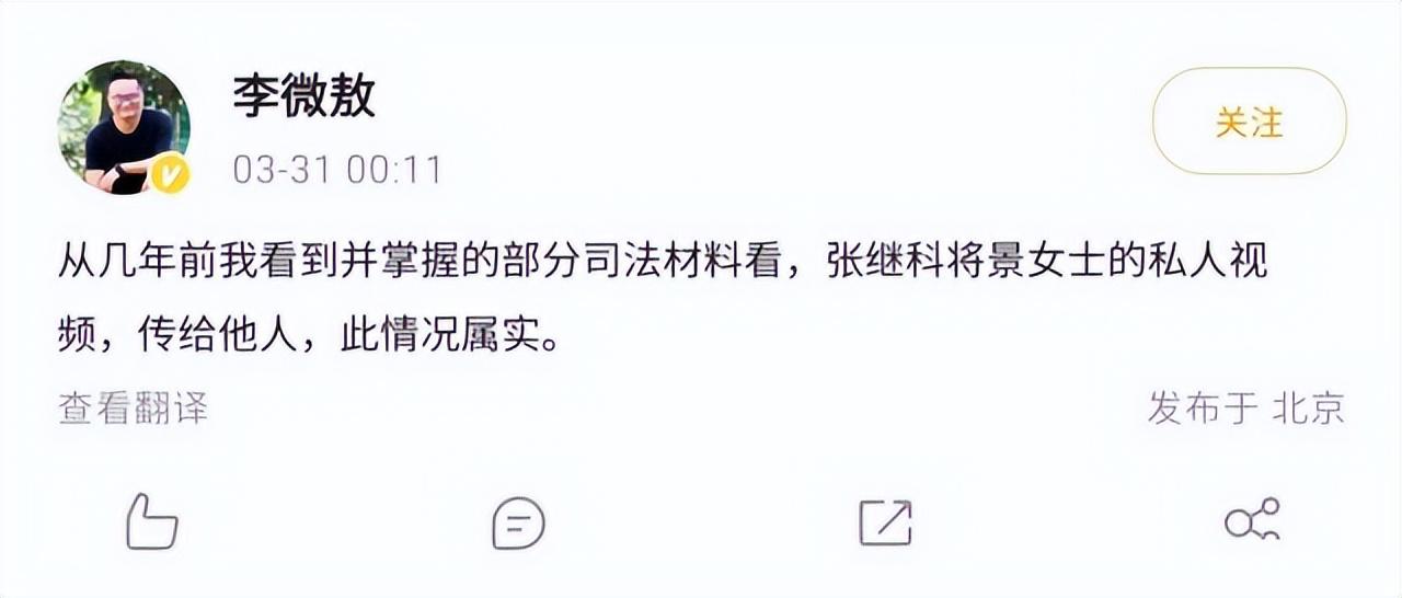 随后又在同一天,李微敖补充道:“景女士的私密视频共计有3条,还有1张视频截图!”经这位大咖一传播,让张继科的形象可谓大跌。毕竟,李微敖是大咖博主,而且又是《经济观察报》的首席记者,其影响力自然要比一般的网友要大。