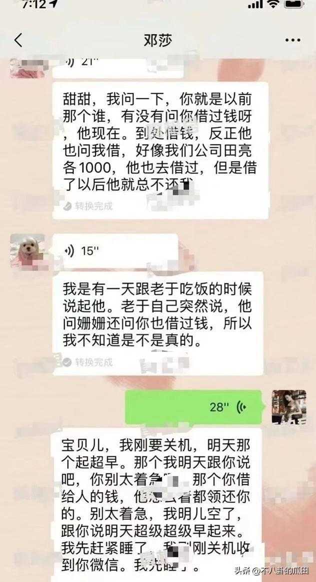 女演员邓莎也被牵扯进了这件事,网上流传了一张她和景甜的聊天截图,截图的内容是她向景甜询问张有没有跟她借钱,还提及了自己和田亮都被借过钱,可是对方没有归还。