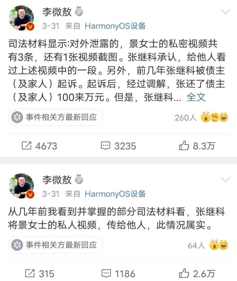 本以为张继科风波会随着张继科工作室的声明打住,谁知道碰到了头铁的记者李微敖,这位哥在331连发两条博文表示张继科将景甜的私人视频传给他人,属实,还表示这是司法材料显示的!