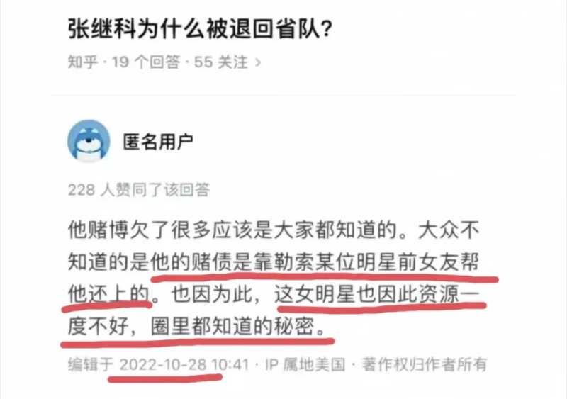 事情发酵起来后,有网友发现在“张继科为什么被退回省队”的问题下,有匿名用户也表示他的赌债靠勒索某位前女友女星还上,并且女星因此资源一度不好,这个回答在2022年10月28日,也就是说在李微敖之前就有人说过这个事,只是这几天才闹上了热搜被更多人知道!