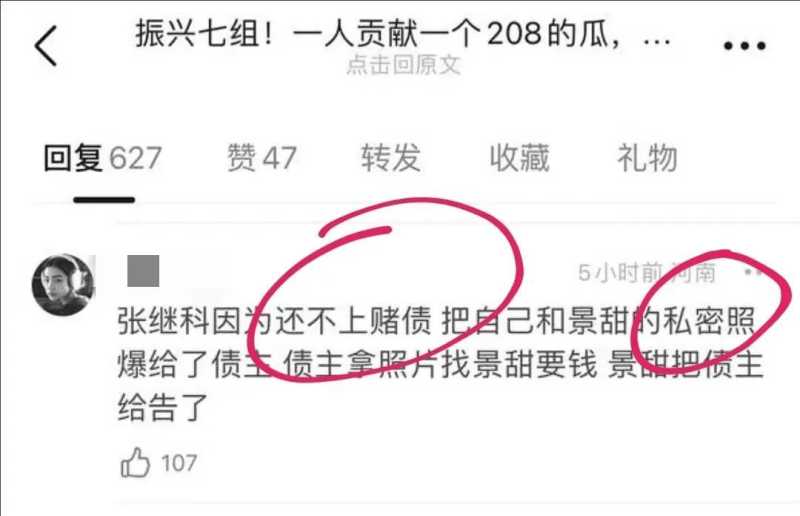 李微敖本人更是发长文描述来龙去脉,大意是张继科欠债主S先生2200万,张继科写500万欠条后,将景甜的私密视频给了债主,还说跟景甜有共同房产,让债主找景甜讨要1700万,债主在2019年12月到2020年1月一直在找景甜的经纪人要钱并发了那三段视频和截图,景甜这边最终选择报案,2020年2月债主被抓!