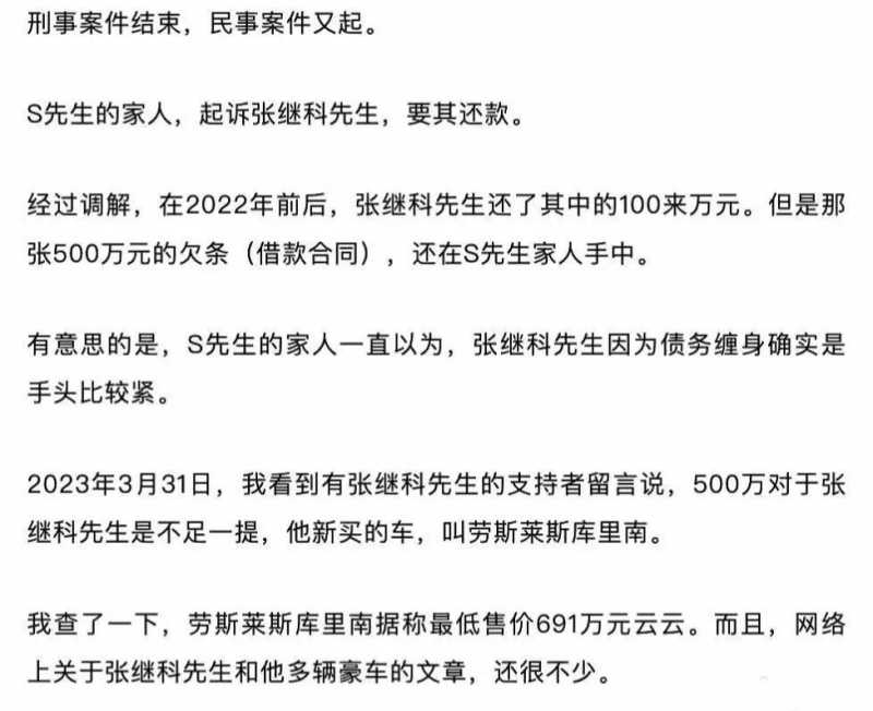 债主拿视频敲诈景甜的刑事案件结束后,债主又起诉张继科欠钱不还开始了民事案件,李微敖表示债主一直以为张继科手头紧,结果张继科新买了一辆691万起步的劳斯莱斯库里南,也就是说张继科有钱但不还!