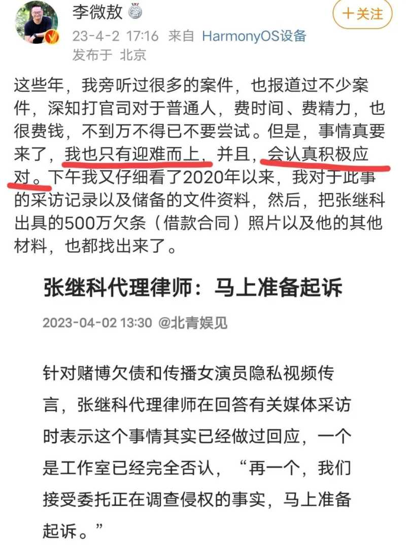 全方位多角度被证实,张继科方继续嘴硬表示将起诉,而李微敖更加头铁硬刚,不仅准备做应诉打算,还曝光了500万借条,张继科的签名和手印都在,可见李微敖所言不虚!