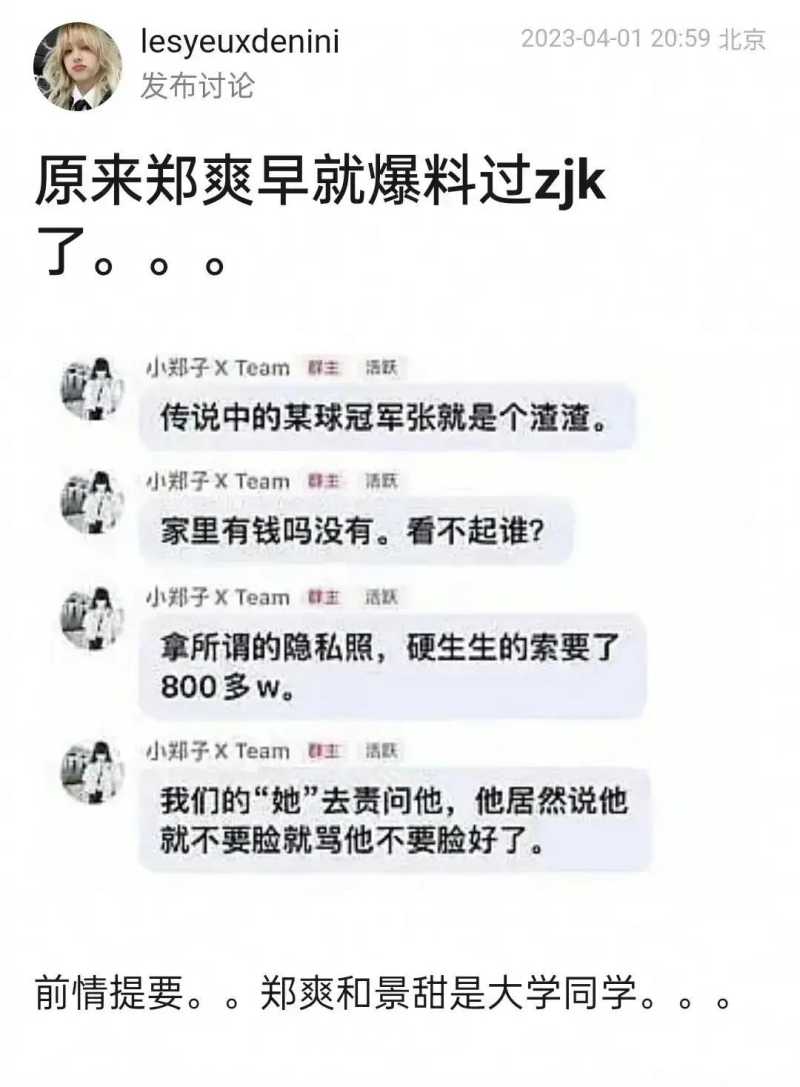 除了论坛爆料、李微敖爆料外,某爽也在直播时爆料过某球冠军张某是个渣渣,拿隐私照索要了800多万,“我们的她”去质问,张某说他就不要脸。某爽跟景甜是大学同学,张继科这个事越发锤了!