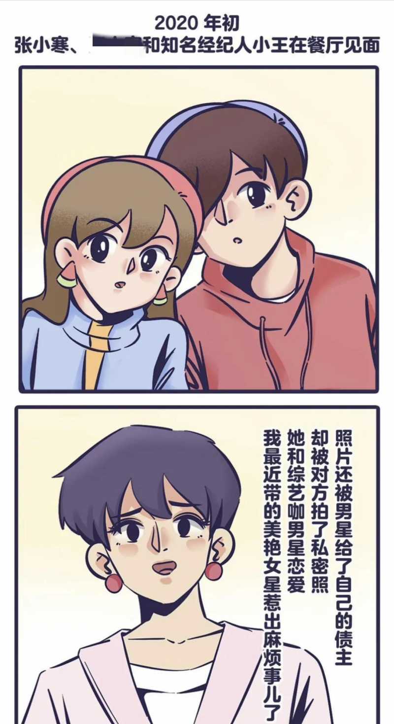 除了这个匿名爆料,狗仔张小寒的漫画也引发热议,2020年初张小寒与王姓经纪人见面,被告知美艳女星和综艺咖男星恋爱,被对方拍了私密照,对方卖给了债主,现在也被解码是景甜和张继科,张继科退役后就是综艺咖!