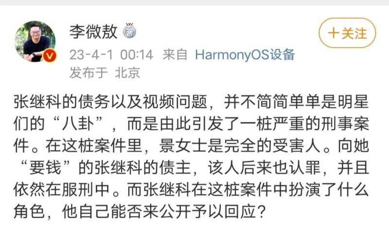 结果李微敖不仅不怕,0401凌晨再度开麦,直言张继科的债务和视频问题已经不是简单的明星八卦,而是严重的刑事案件!表示景甜是完全的受害人,债主因为敲诈景甜在坐牢,并期待给债主提供私密视频的张继科公开回应。