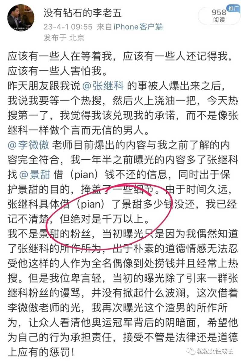 而另一网友更是跳出来指出张继科至少借了景甜女士千万以上。