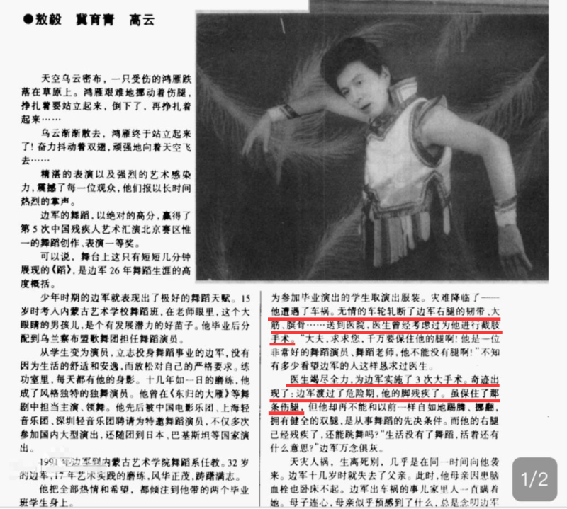除此之外,边军父亲在他十几岁的时候就去世了,母亲因患脑血栓长期卧床不起,即便在这样的情况下,他都没有放弃原本的舞蹈梦想,凭借超乎寻常的毅力与韧劲继续坚守在舞台之上,身残志坚的他通过努力获得了更多业内认可,还被评选为国家一级演员,据了解,边军也是第一个将蒙古族舞蹈带出国门的残疾舞蹈家。