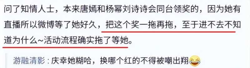 结果到活动都快结束了还是没等到人,85花们上台领奖时,原本官方是准备了5样道具,因为唐嫣的缺席,不得不让前辈惠英红临时补上,