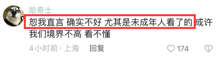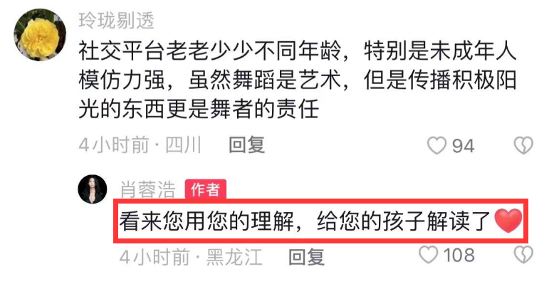 另外,还有网友表示未成年人的模仿能力强,虽然是舞蹈,但传播积极阳光的东西更是舞者的责任,对此她似乎并不认同,回复这位网友说她用自己的理解给孩子解读了,这是暗戳戳指责对方眼界狭窄吗?