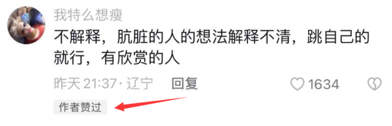 可以看到,即便肖蓉浩作出回应,但她的评论区已经翻车,为此肖蓉浩还点赞了网友的留言,对方表示肮脏人的想法解释不清,跳自己的就行,有欣赏的。肖蓉浩点赞这样一条动态,这是认为给予差评的网友都是不懂艺术之人,甚至思想肮脏才会觉得不雅,这情商也太低了吧。