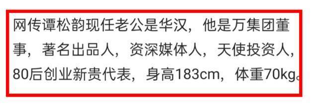 据悉,近日有爆料声称32岁的谭松韵已经秘密隐婚,爆料谭松韵老公是万达董事华汉,如今一向行事低调的谭松韵工作室也终于拿出强硬的姿态,面对外界愈发离婚的舆论明确予以回击,这也给粉丝吃了一颗定心丸。