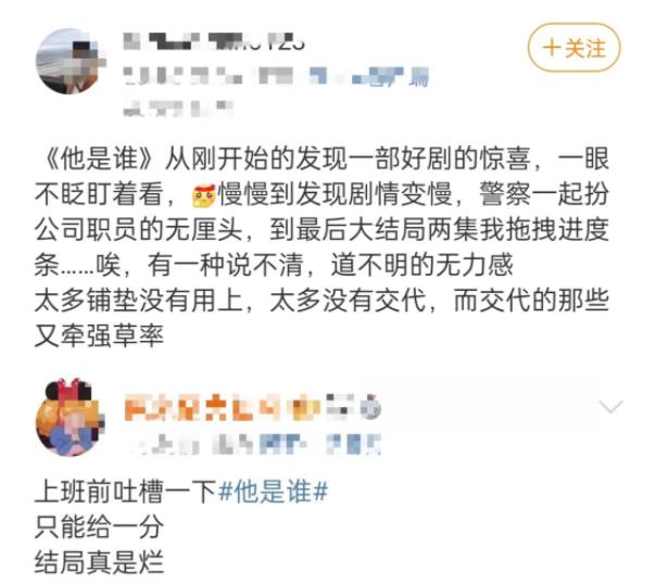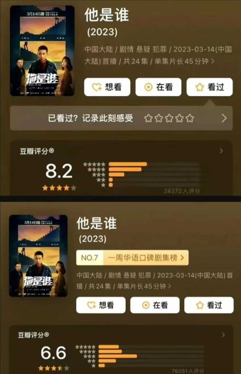 《他是谁》结局播出后,观众差评不断,评分从8.2分,瞬间跌到6.6分。