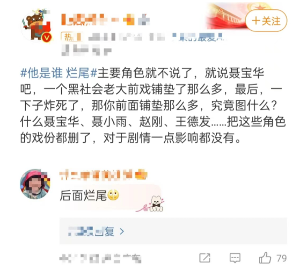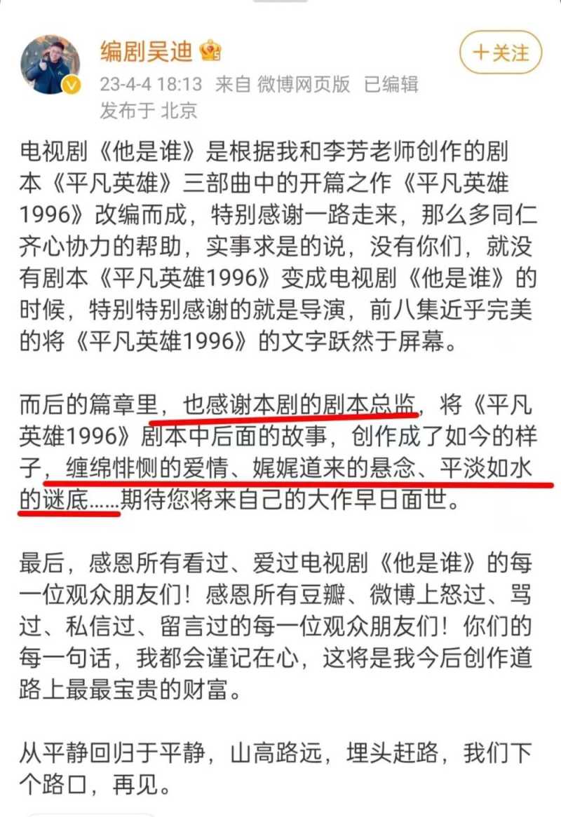别说观众看不下去了,编剧吴迪也很无语,发文回应,称前八集是他写的,后面变成了剧本总监,吴迪内涵道,“感谢本剧的剧本总监,创造了如今的样子,娓娓道来的悬念,平淡流水的谜底”。