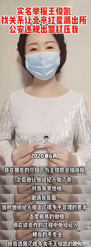 视频中一位女子手持身份证,表示2020年6月份,她在朋友的介绍下与王俊凯合拍海报。之后王俊凯让其经纪人加了自己,对她也很热情。