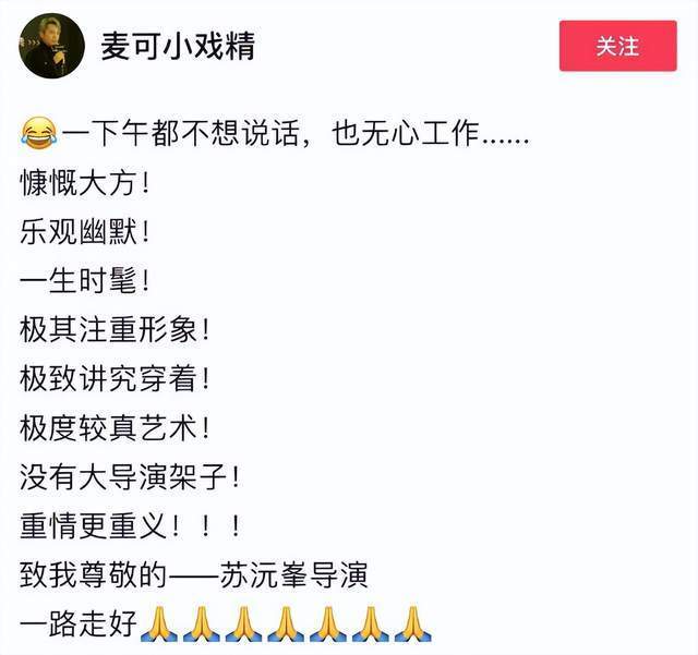 从大家的发文中可以得知,苏沅峰生前为人亲善,性格慷慨大方、乐观幽默、一生都在追求时髦,对自我形象格外讲究,对待工作苏导更是极度较真,精益求精,在大家眼中,他始终重情重义,没有半点大导演的架子。