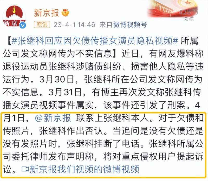 4月1日,据@新京报 报道,对于欠债和照片,张继科作出否认。当追问是没有欠债还是没有发照片时,张继科挂断了电话。