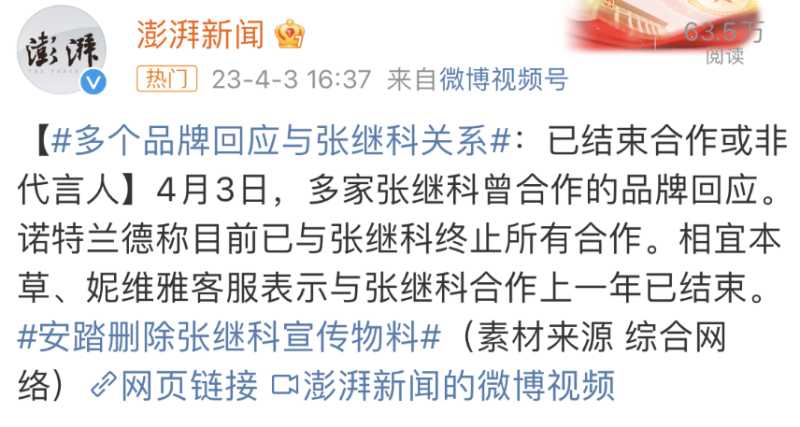 4月3日,安踏、舒肤佳、妮维雅等多个品牌撤下张继科代言的宣传物料,其中部分品牌表示已终止与其的合作。