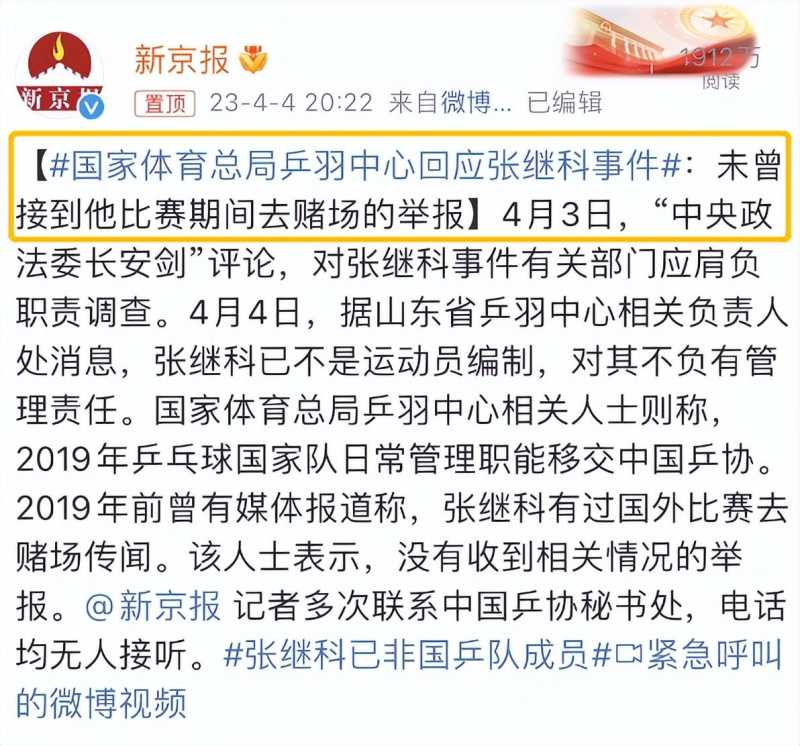 4月4日,国家体育总局乒羽中心回应张继科事件:未曾接到他比赛期间去赌场的举报。