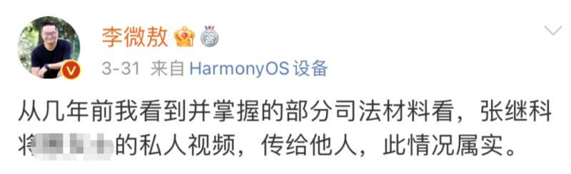 3月31日,一位叫李微敖的记者(经济观察报首席记者,新闻调查记者,不是“娱乐记者”),发博直接表示:“从几年前我看到并掌握的部分司法材料看,张继科将某明星的私人视频,传给他人,此情况属实。”