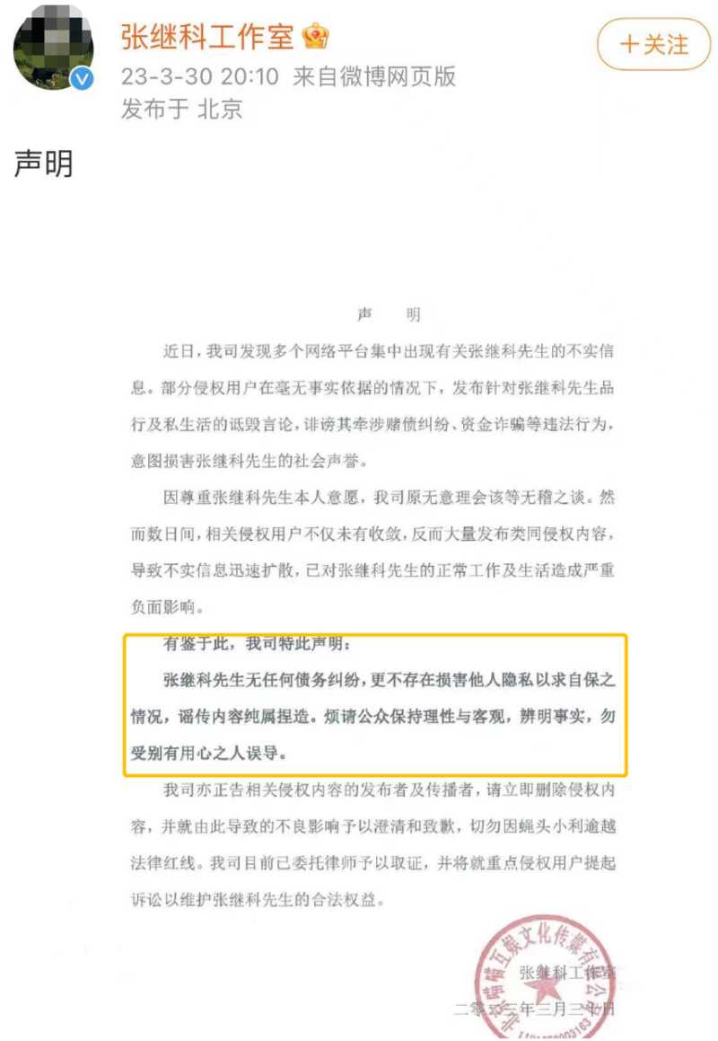 3月30日,张继科工作室发声明,称张继科无任何债务纠纷,更不存在损害他人隐私以求自保之情况,谣传内容纯属捏造。