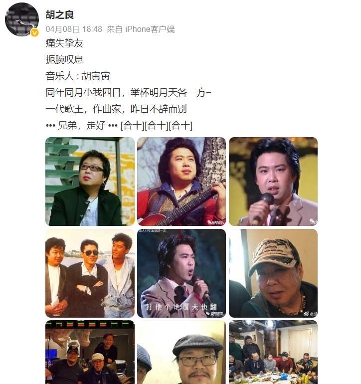 胡寅寅的离世让不少人感到惋惜与遗憾,萨克斯风演奏家胡之良也亲自发布动态送别挚友,从文中可以得知,胡之良与胡寅寅是同年同月生,两人私下也交情深厚,情同兄弟,在胡之良心目中,胡寅寅更是一代歌王,言语之中流露出对挚友的欣赏与敬佩。