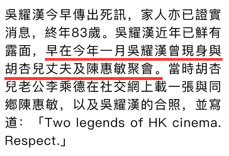 据了解,吴耀汉最后一次公开露面要追溯到今年1月份,胡杏儿的老公李承德曾晒出合影,镜头中的吴耀汉看上去老态龙钟,满头白发衰老明显。