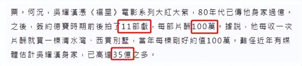 因为出道较早,赶上了港片发展的黄金期,早年的吴耀汉一度片约不断,为此积累下不少财富,拍戏三年就赚下了11栋楼,更是拥有35亿港币家产,折合人民币超30亿。不过在教育子女方面,吴耀汉一直坚守让孩子自力更生的原则,在经济方面没有给孩子太多接济。