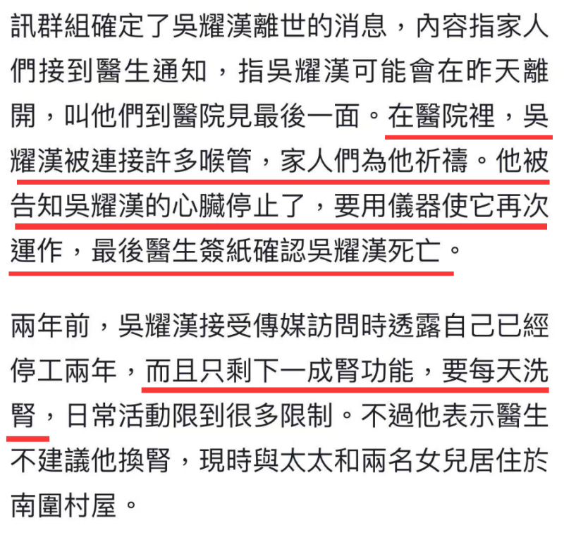 报道中称,吴耀汉在离世之前,其家人已经接到医院方给出的通知,家人们纷纷赶来与其最后告别,临终前吴耀汉的喉咙处被插满了管子,可见医院方一直对其进行奋力抢救,只可惜在家人们的祈祷声中,奇迹依旧没有出现。