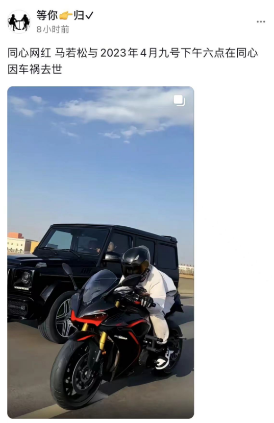 在事故发生前一天(4月8日),马若松还照常与大家直播聊天,前几日,马若松还在直播中兴致勃勃地提到自己某天可能会因为骑摩托车上热搜,孰不知被他一语成谶,以这样惨痛的方式让更多人知道了他的名字。