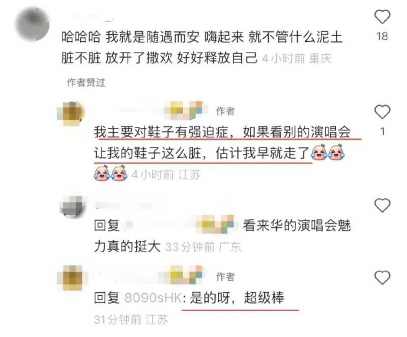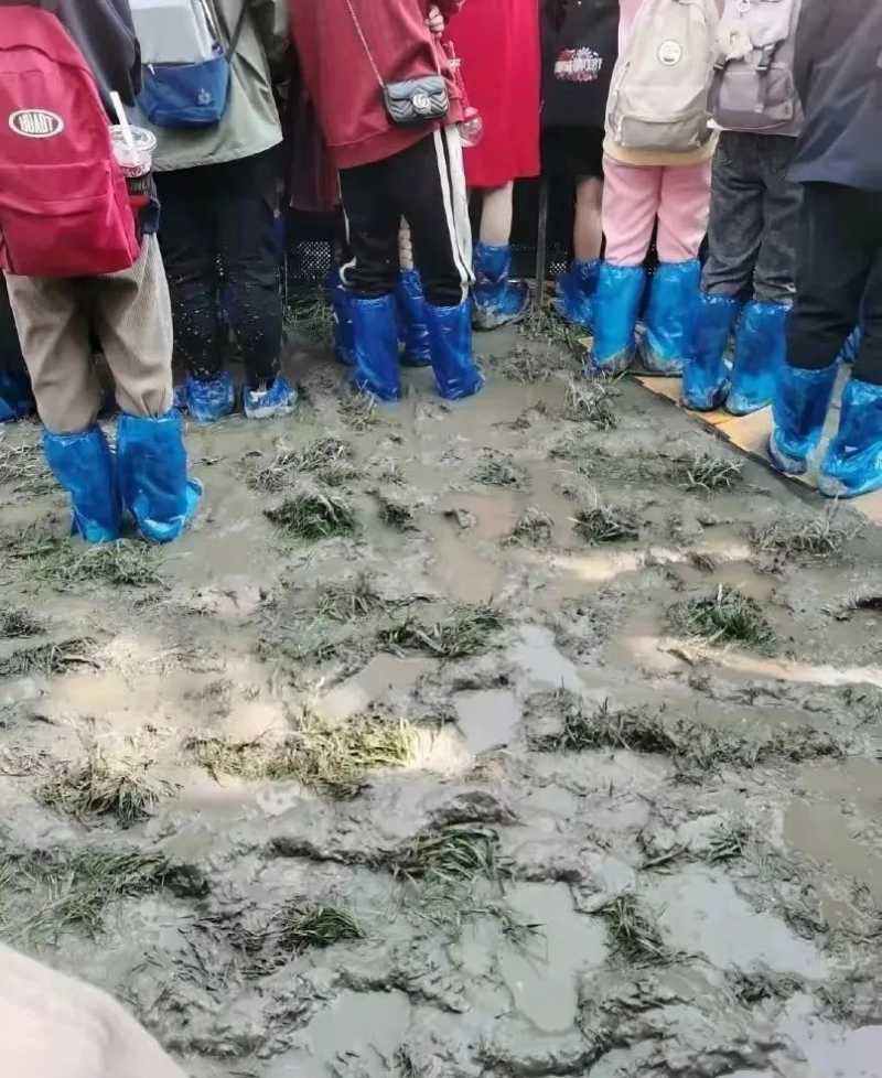 通过现场粉丝拍摄的照片可以看到,大家虽然都穿着鞋套,可是由于草坪上还积着雨水,坑坑洼洼的,蓄了水的泥地踩起来深一脚浅一脚,不免还是会弄脏鞋裤。