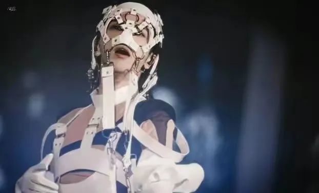 华晨宇的上半身做了白色的绑带设计,甚至蔓延到了头部,绑带像个面具一样罩在了他的脸上,甚至飘逸得把视线都挡完了。