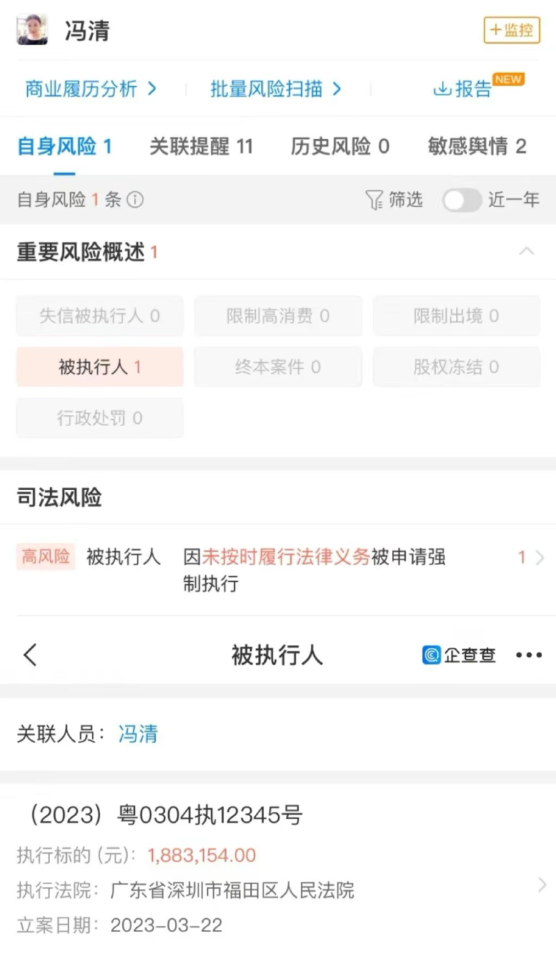 直到18年9月份,冯清欠款事宜才被法院强制执行。