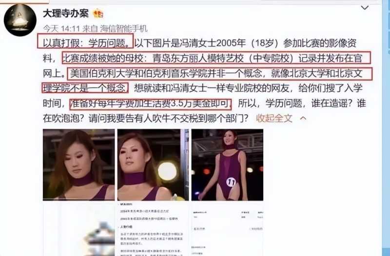 爆料人称冯清的母校是东方丽人模特艺校,一所中专院校。