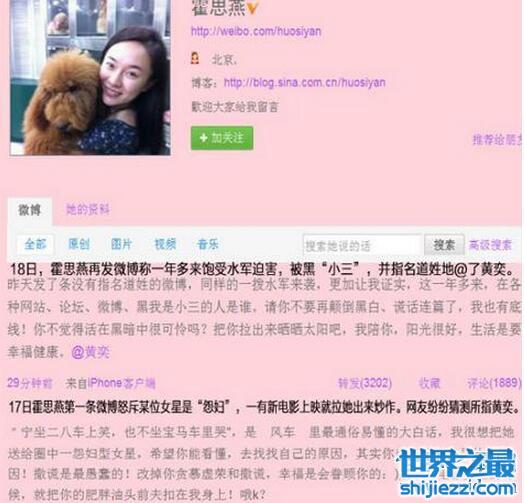 在霍思燕接下来的微博中,她也干脆将公众的猜测转为更为具体的描述,称一年多来,在各种网站、论坛、微博,一直有言论指她是“小三”,微博最后更直接@了黄奕,表明自己已经忍到底线。有知情人称“思燕这一年多来,老有人说她是第三者,她觉得很冤枉,她这次发微博是长期委屈情绪的总爆发。”