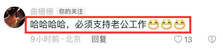 此外,曲栅栅还不忘来到视频评论区留言,声称自己必须支持老公工作,简短的一句话却流露出无尽的甜蜜。