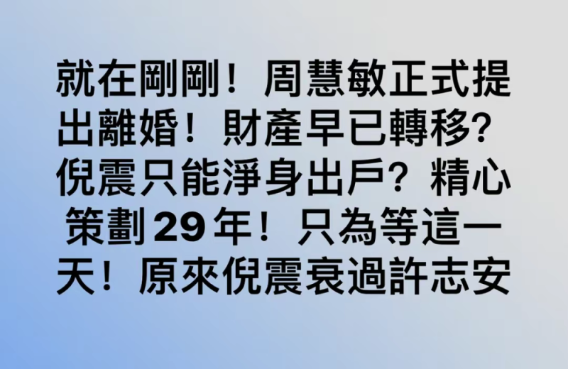 近日,网曝周慧敏向倪震提出离婚,男方疑将净身出户,女方早已经转移财产,这场离婚也是周慧敏“蓄谋已久”的计划。